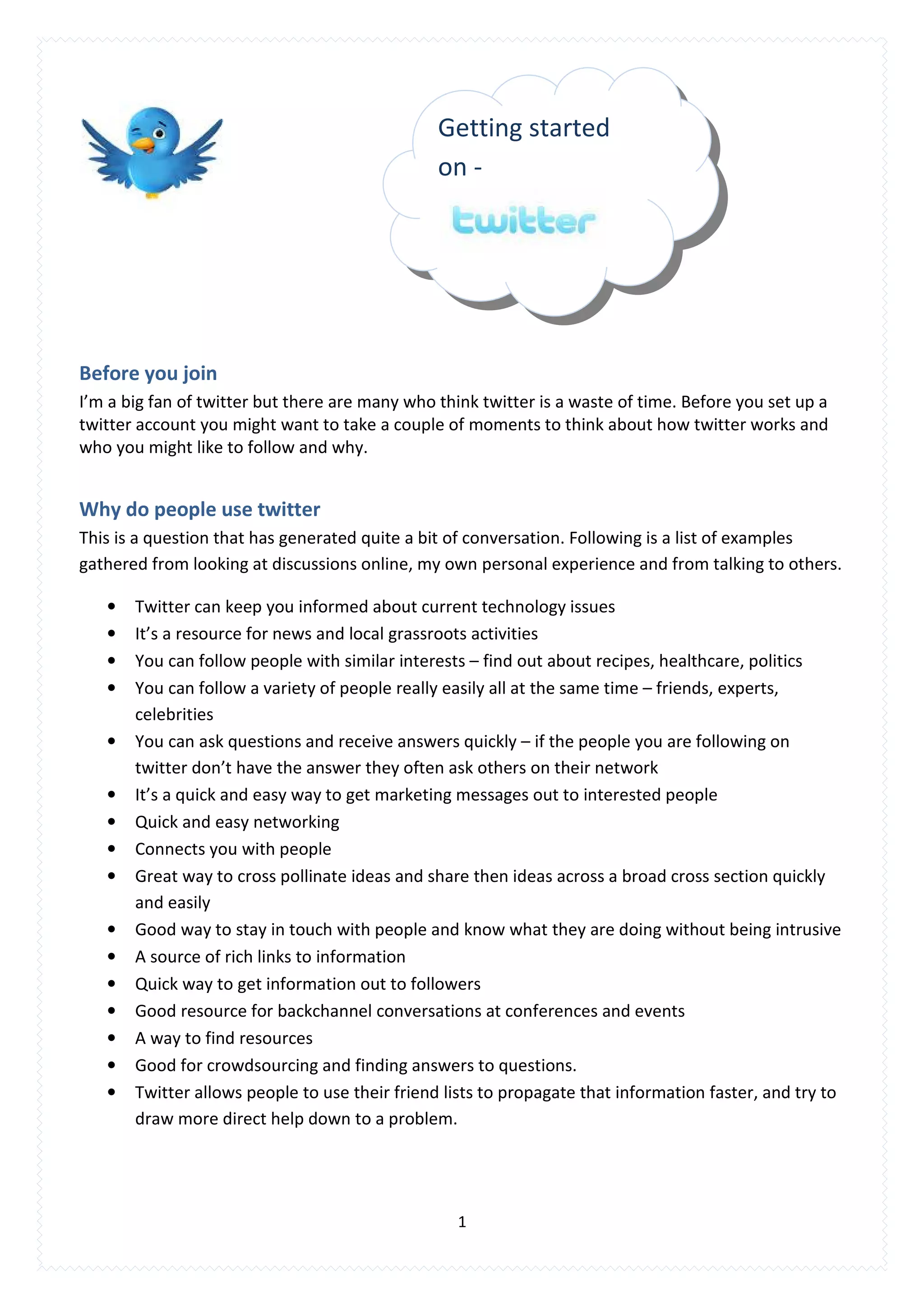 The document provides information and tips for setting up and using a Twitter account, including: