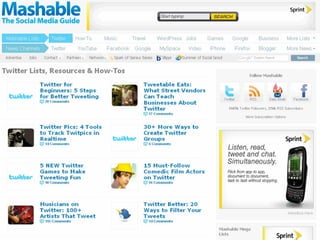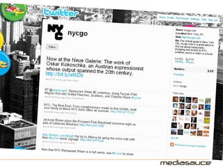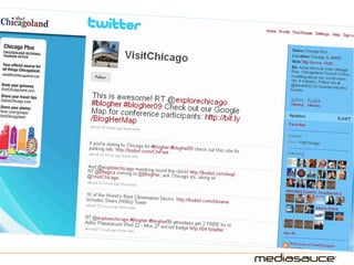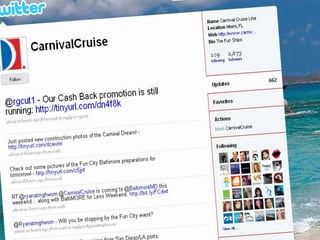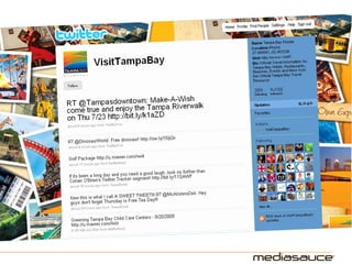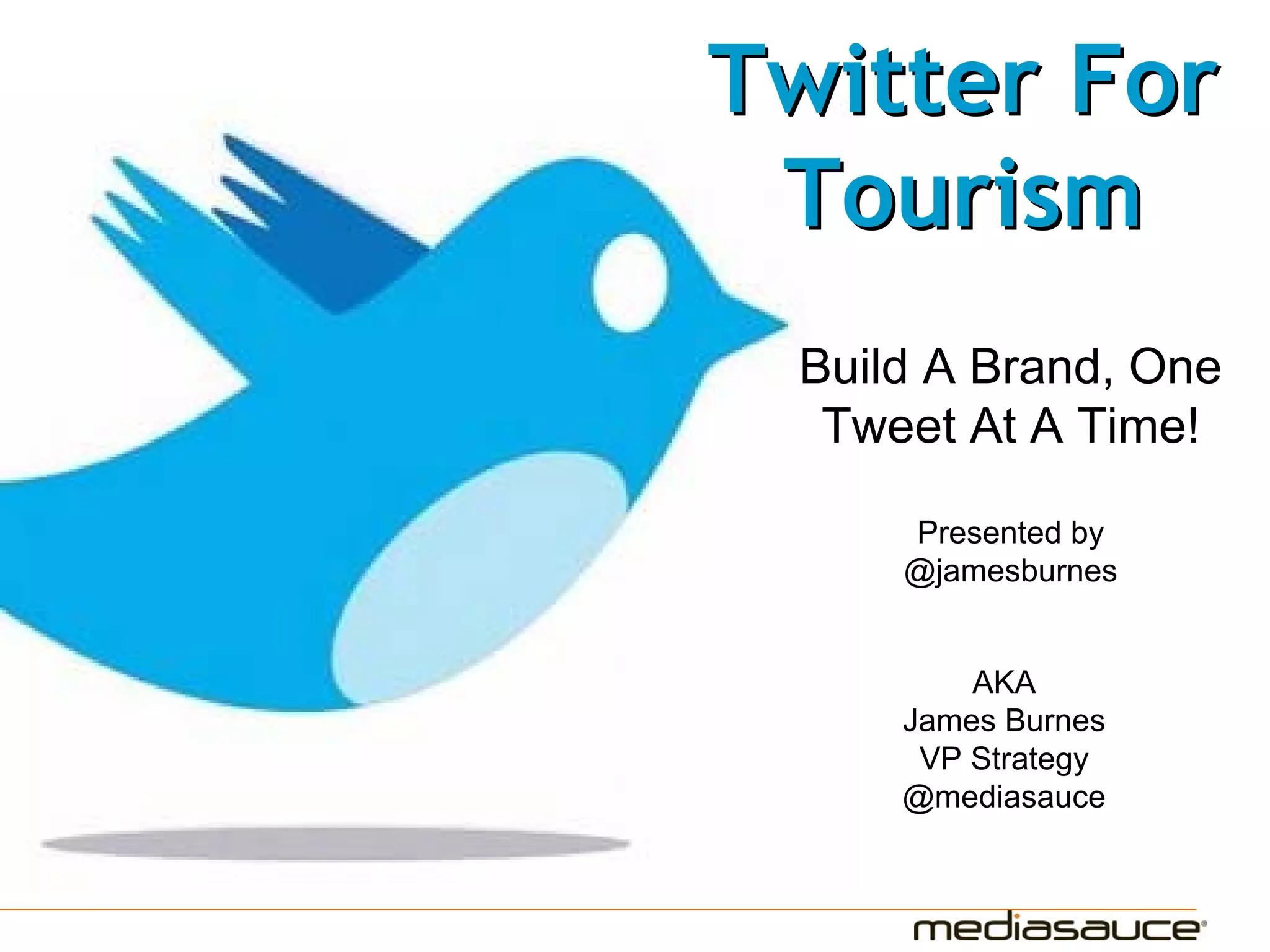The document discusses the significance of Twitter for tourism branding, emphasizing the need to engage with audiences, maintain a consistent 'voice', and actively participate in conversations. Key components include creating a proper background, identifying content sources, and understanding top-performing Twitter accounts in the tourism sector. Recommendations suggest that brands should tweet about events, news, and deals while fostering interactions with followers.