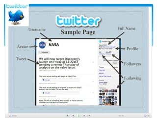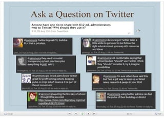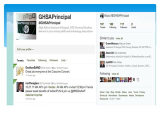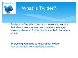 This document provides an overview of Twitter and how it can be used professionally by educators. It defines key Twitter terms like tweets, hashtags, replies and retweets. It outlines how Twitter can be used to rapidly disseminate school information, reminders and updates. It also discusses the benefits of using Twitter to build a personal learning network and access educational resources from following other experts in the field.