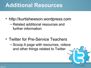 The document outlines the benefits and basics of using Twitter for educators, emphasizing the importance of networking, staying informed, and developing technology skills. It provides steps for starting a Twitter account, tweeting effectively, and utilizing hashtags and chats for professional growth. Additional resources and support channels are also shared for further engagement in the Twitter education community.