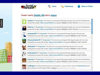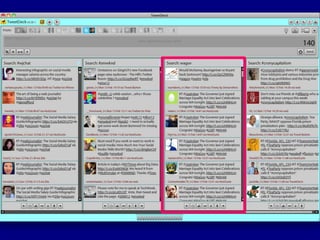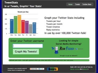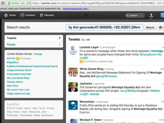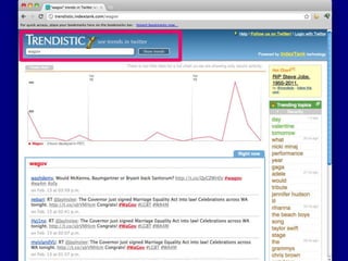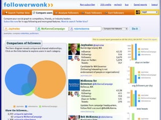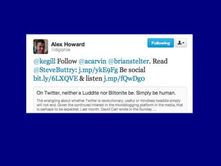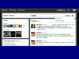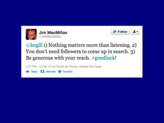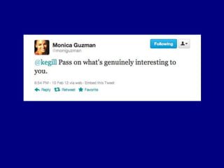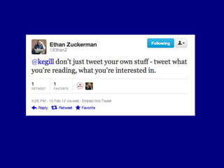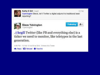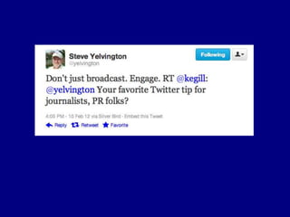 This document provides tips for reporters on using Twitter effectively. It recommends that reporters tweet more to develop their personal brand, have conversational tweets by asking questions, and use hashtags and tools to monitor stories and crowdsource ideas. Reporters are advised to listen on Twitter by following others in their beat and verify information. Various tools are outlined to help with monitoring hashtags, geotagging tweets, embedding tweets in stories, and signing up for Twitter lists and directories.