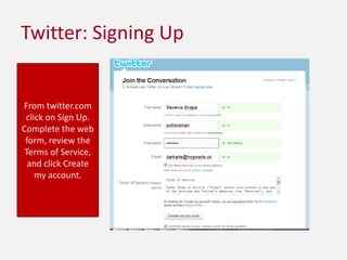 2) Key Twitter features covered include the timeline, profile stats, trends, expanding tweets, retweeting, mentioning others, searching, and using hashtags to organize conversations. Shortened URLs and the 140 character limit are also addressed.