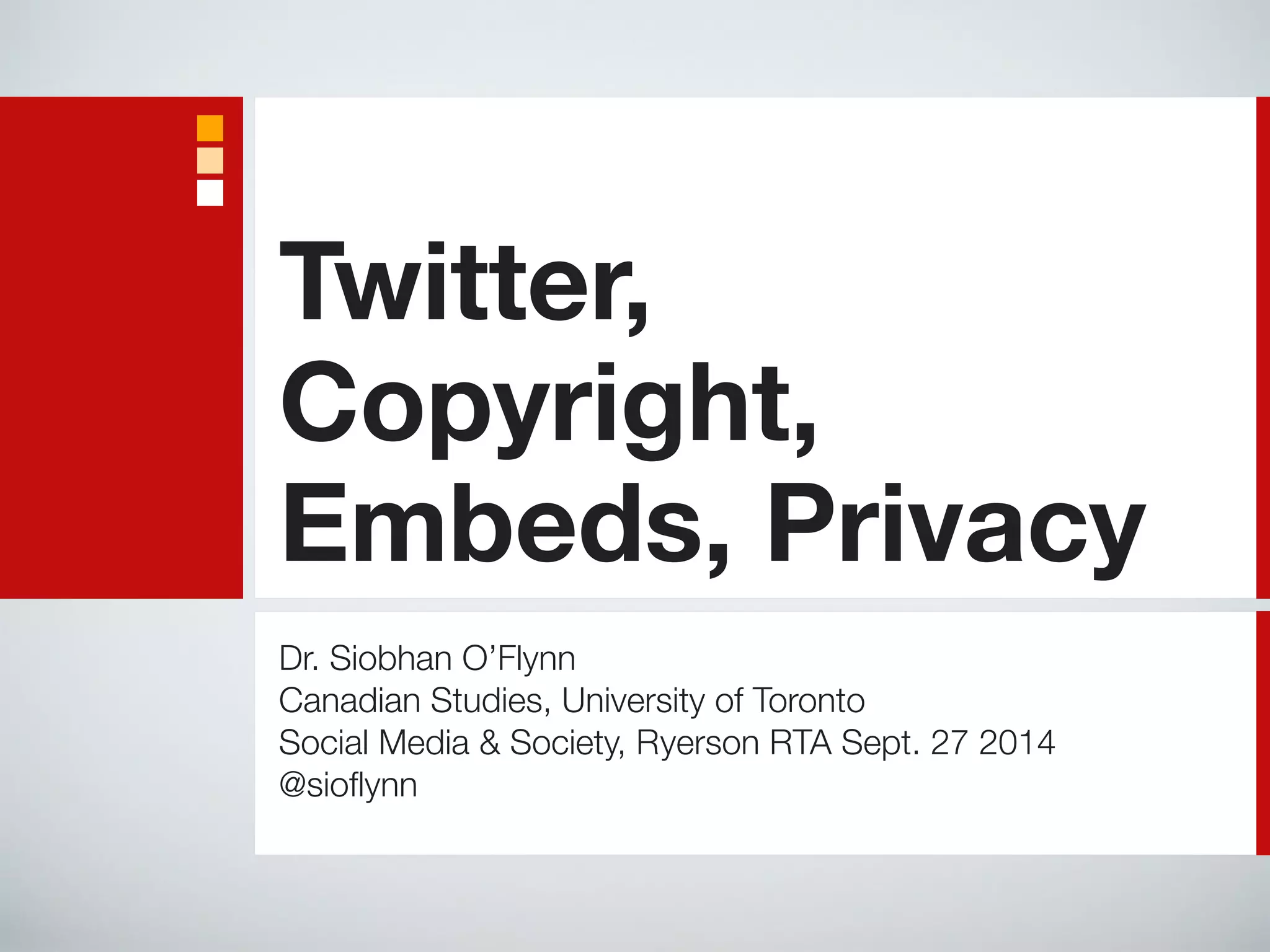 This document discusses Twitter's terms of service regarding content sharing and embedding tweets. It summarizes that under Twitter's terms, any public tweets can be shared by third parties without permission as Twitter sees itself as a public forum. However, this creates legal issues regarding copyright and assumptions of privacy. Specifically, embedding tweets makes content shareable across platforms but the terms contradict expectations of privacy and do not sufficiently protect intellectual property rights.