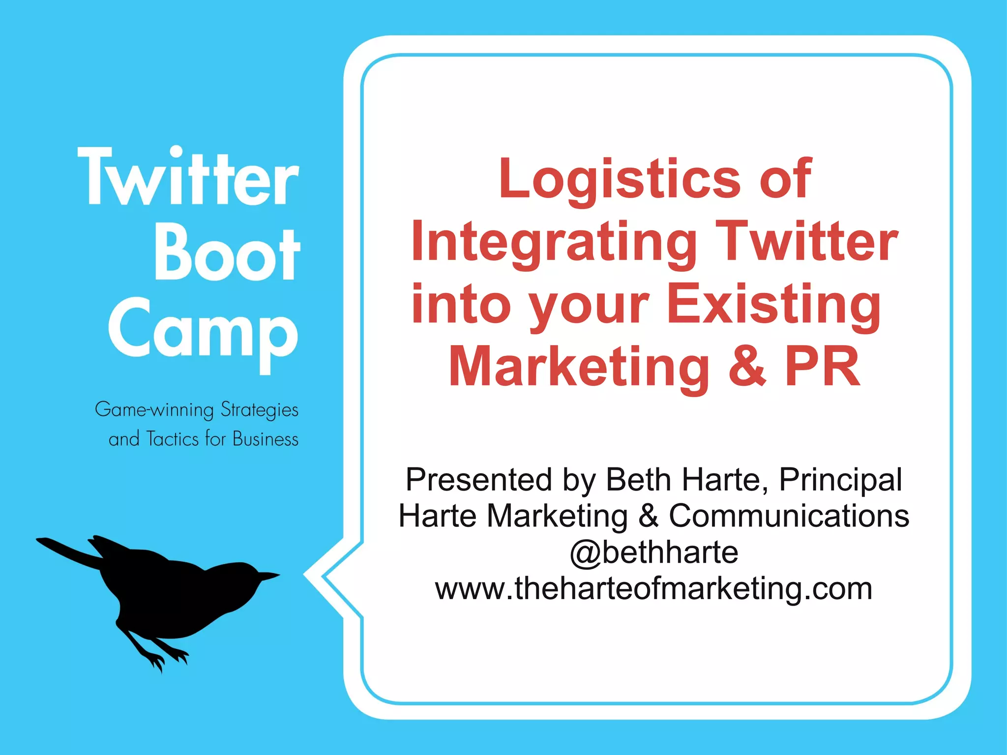 This document discusses the importance of having a plan for integrating Twitter into existing marketing and PR strategies. It recommends defining measurable objectives for Twitter use, including outputs, outtakes and outcomes. It also stresses the importance of establishing a Twitter strategy and tactics, knowing your starting and ending points, using tools to measure results, and iterating the process to make management happy with the return on their investment in Twitter.