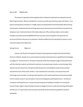 The documents discuss various Twitter accounts related to education. The first account, @WISEinWV, promotes sex education in West Virginia schools. The second, run by George Couros, shares ideas on educational innovation through different technologies. The third, by Josh Stumpenhorst, believes teaching and learning occur together through active engagement. The fourth, Harold Blanco's class page, provides resources and opinions on technologies and current events. The fifth, @CB360updates, gives updates on college baseball that could educate through relatable content. The final passage discusses the communication app Zello and how it could be used in classrooms.