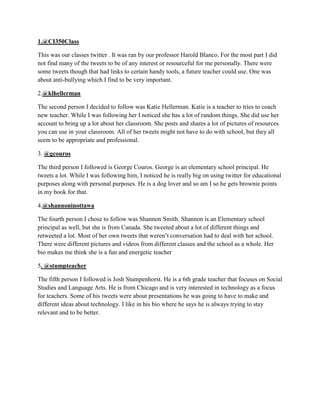 This document discusses 5 different Twitter accounts that were followed for a class. It summarizes each account, noting that the first was run by the professor and had some useful links. The second shared classroom resources and was professional. The third focused on using Twitter for education and shared personal interests. The fourth posted about their school and classes. The fifth was a teacher interested in technology who aimed to improve.