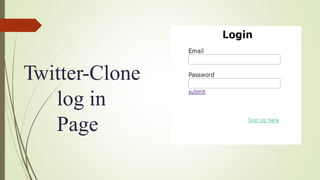 The document outlines a Twitter clone project by Durga Sankar Puhan and Kanta Anurag Sahoo, detailing features such as user authentication, tweet management, profile settings, and image uploading. It discusses the user interface components and functionality, including home page navigation, tweeting capabilities, and Firebase integration for data storage and hosting. The project employs React, CSS, and HTML5, and emphasizes the structured organization of the code.