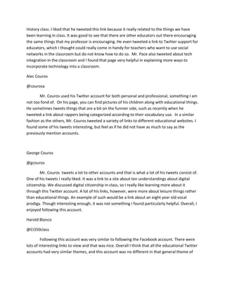 - Alec Couros used Twitter for both personal and professional topics, including educational links and some humorous tweets. The reviewer found some tweets interesting but not as many as others.