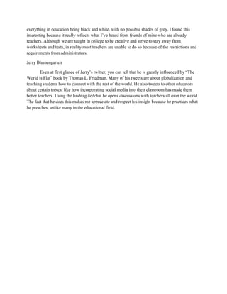 - Jerry Blumengarten is influenced by "The World is Flat" and tweets about globalization and connecting students worldwide using hashtags like #edchat.