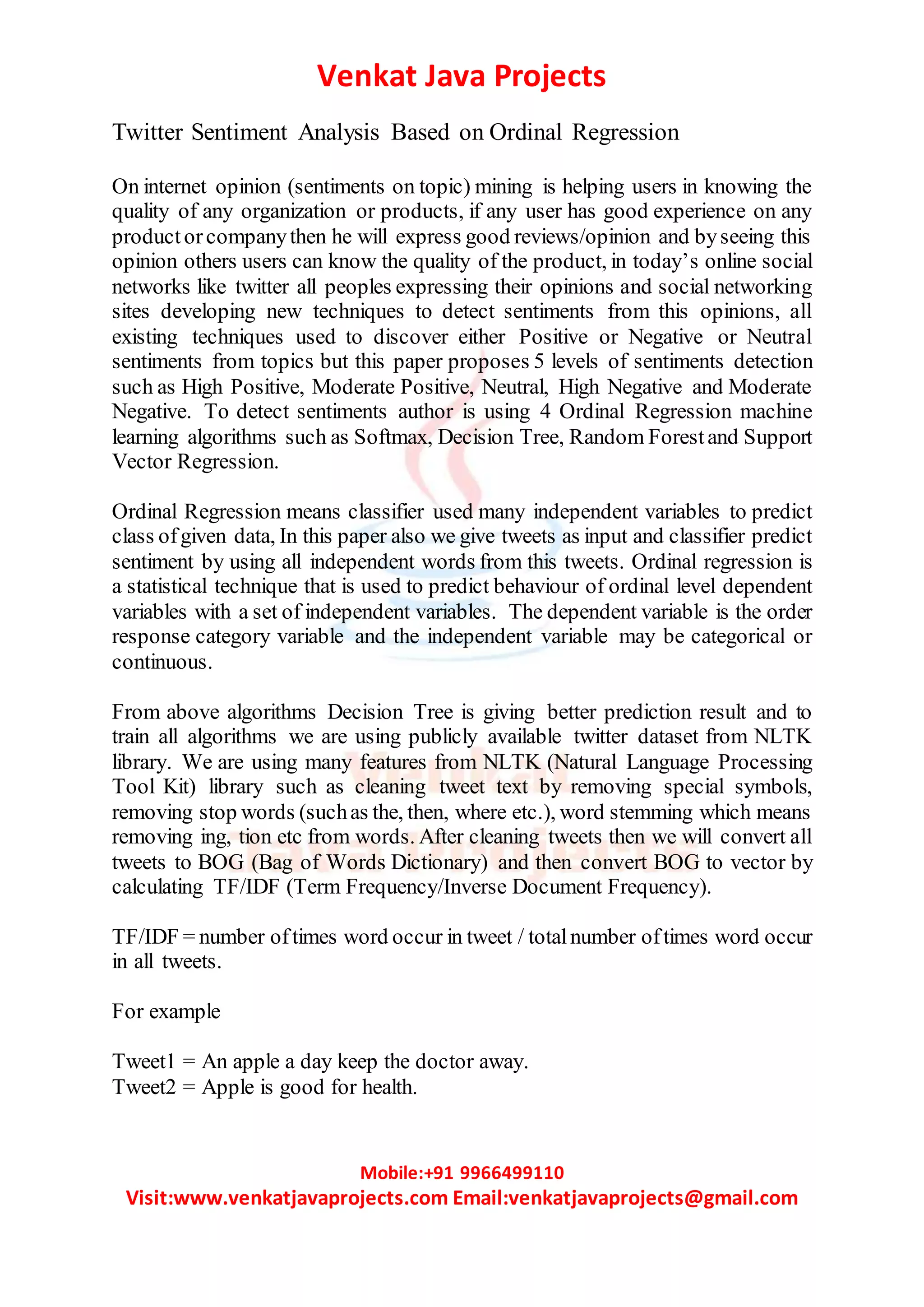 The document discusses a sentiment analysis project that employs ordinal regression to categorize opinions from tweets into five sentiment levels. It utilizes machine learning algorithms including decision trees and random forests, focusing on preprocessing techniques like tf-idf for text vectorization. The results indicate that decision trees yield the highest prediction accuracy, demonstrating the efficacy of the proposed methodology in sentiment detection.