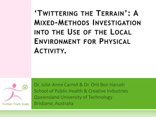 The document outlines a mixed-methods research study investigating the use of local environments for physical activity, emphasizing the relationship between demographics, geography, and health outcomes. It seeks to address gaps in understanding how socio-demographic factors and the physical environment influence physical activity patterns, utilizing tools like GIS and social media for data collection. The study includes case studies in two Brisbane suburbs, with participants reporting their physical activity engagement and interactions within their local areas.