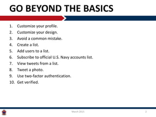 This document provides guidance on customizing and securing your Twitter profile and account. It outlines best practices such as customizing your profile with a header photo, profile photo and bio about your command. It also recommends creating lists to organize accounts you follow and subscribe to official Navy lists. For security, it advises setting up two-factor authentication and contacting Navy officials to request verifying your account.
