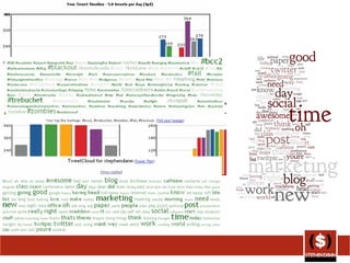 The document discusses analyzing Twitter usage through metrics and categorization. It describes prior research that classified tweets by engagement, topics, and addressivity. The document then presents its own analysis of the author's Twitter history from 2007 to 2009, categorizing tweets as conversational, status updates, passing along information, or news based on grounded theory and previous studies. Minor categories and example tweets are provided for each major category.