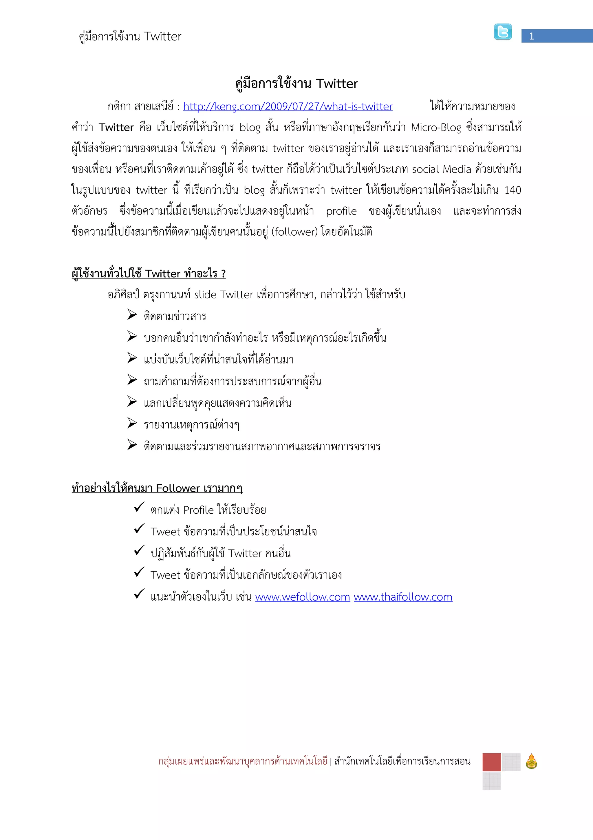 กลุ่มเผยแพร่และพัฒนาบุคลากรด้านเทคโนโลยี คู่มือการใช้งาน Twitter กติกา สายเสนีย์