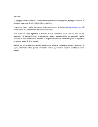 Twitter es un servicio de microblogging que permite a los usuarios enviar y leer mensajes de texto ("tweets") de hasta 140 caracteres. Estos tweets se muestran en la página de inicio o perfil del usuario y se usan comúnmente para compartir noticias en tiempo real, intercambiar opiniones y seguir eventos y personas. YouTube es un sitio web para buscar y compartir videos, donde los usuarios pueden subir, ver y compartir una gran variedad de videos como películas, programas de televisión y música.