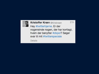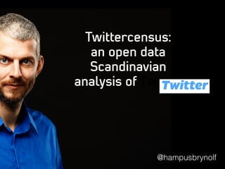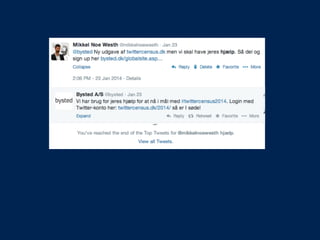The document discusses the launch of Twitter Census, a Scandinavian analysis project, detailing its challenges due to Twitter's API restrictions and its methodology for collecting and categorizing user data. It provides statistics on user activity, growth in Danish Twitter accounts, and analyses engagement through graphical representations. Additionally, it highlights common characteristics among Danish Twitter users, including their language use and follower counts.