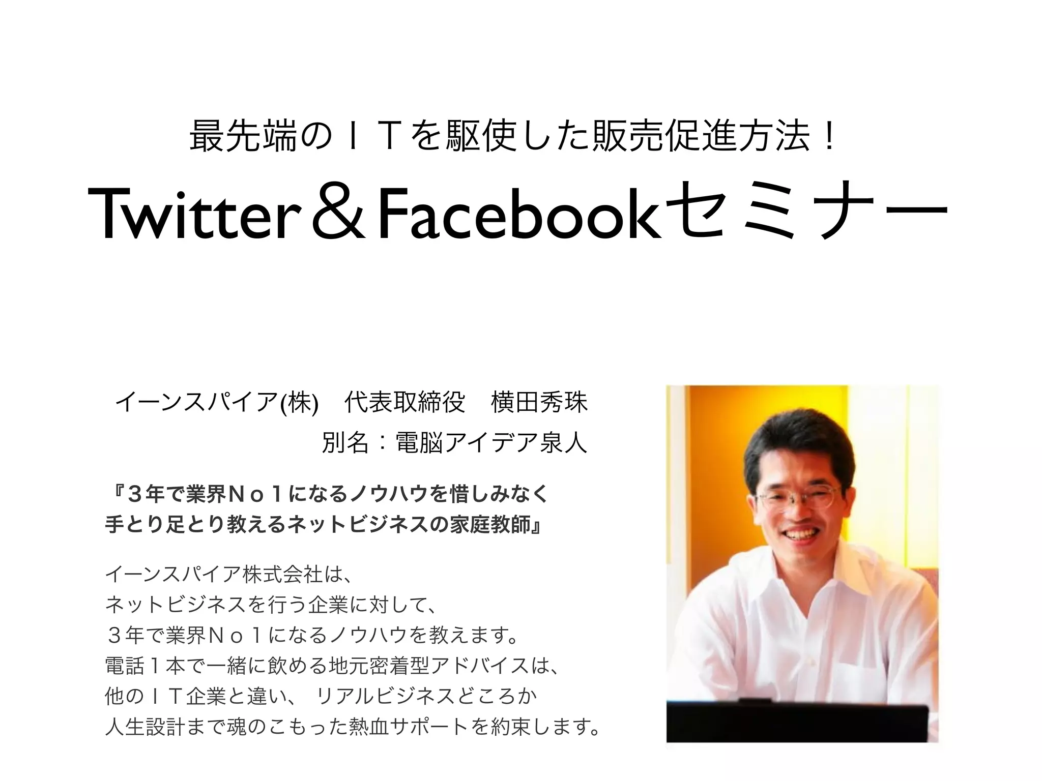 Facebookを使った販促は ネットビジネスではなく リアルビジネスである。 イーンスパイア(株) 横田秀珠の著作権を尊重しつつ、是非ノウハウはシェアして行きましょう。