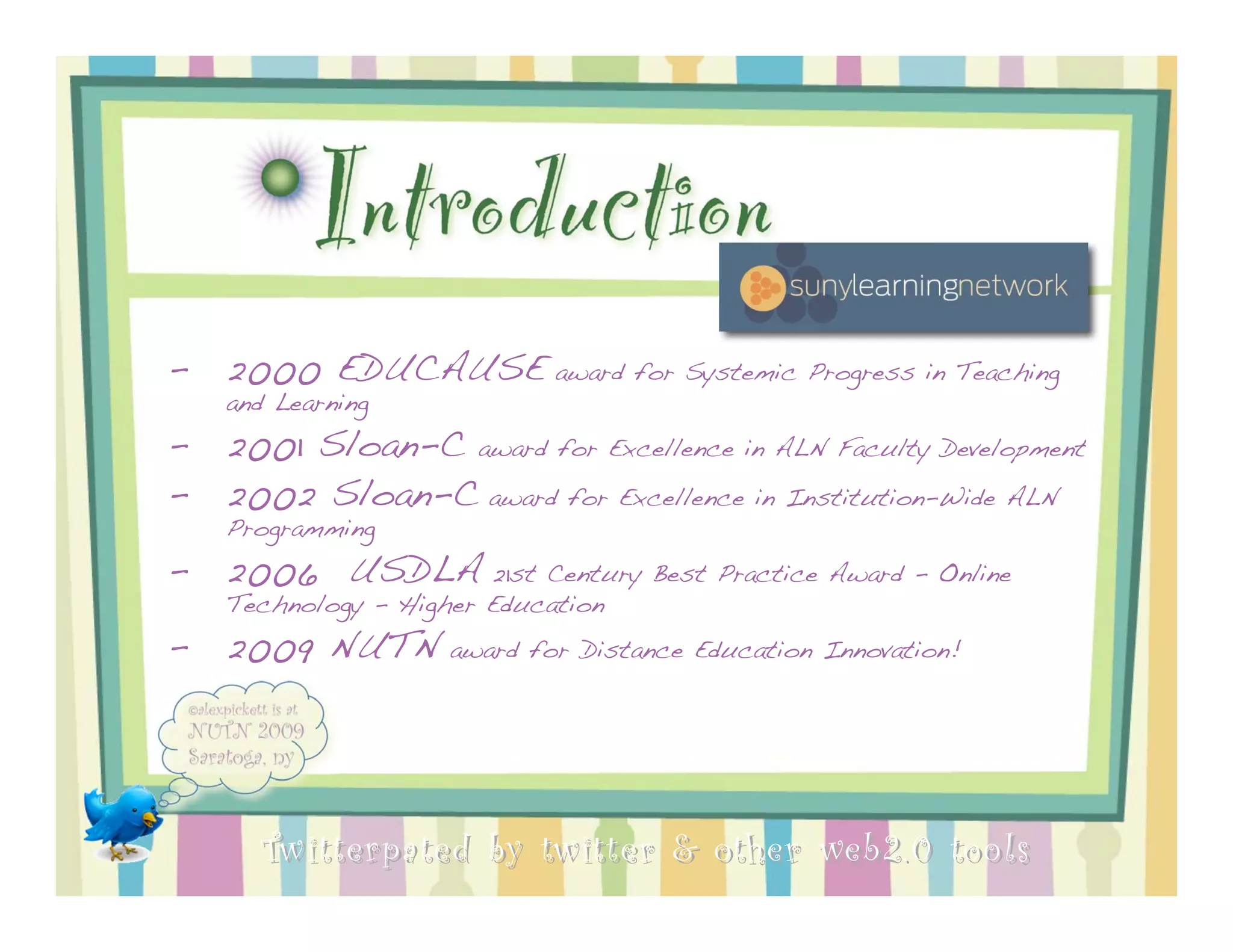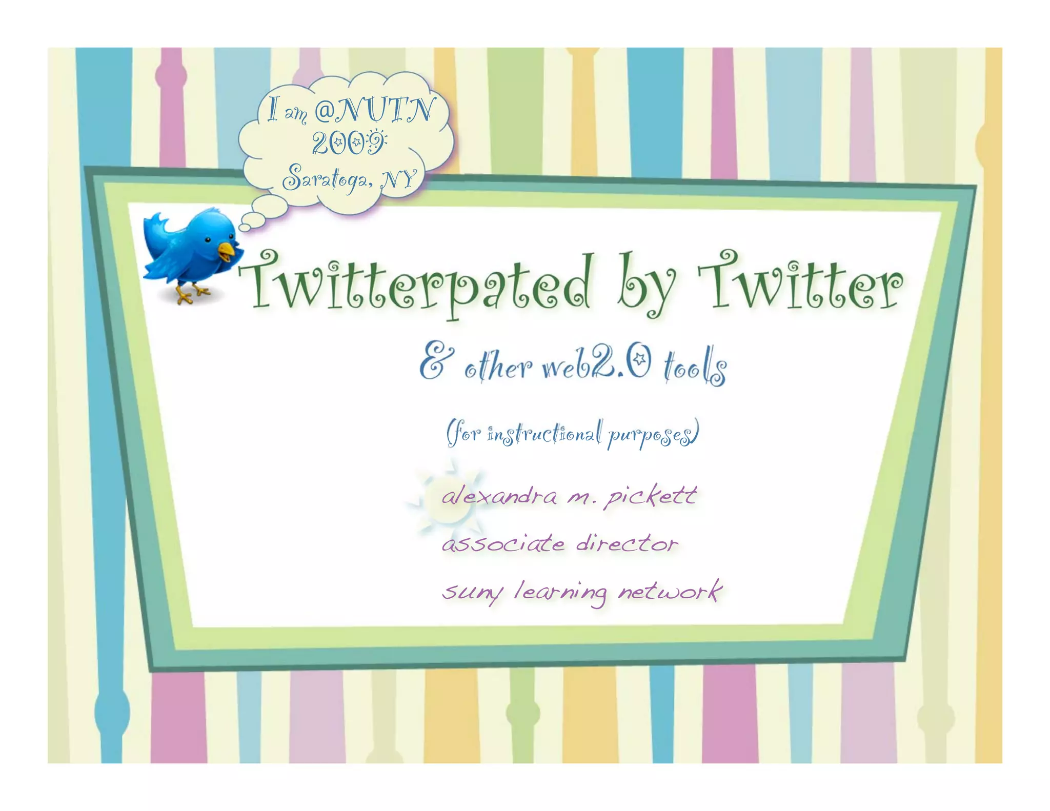 1) The document discusses how the presenter was Twitterpated by Twitter and other Web 2.0 tools and demonstrates how to use tools like Twitter, Voicethread, Diigo, blogs, Jing, and others for instructional purposes.