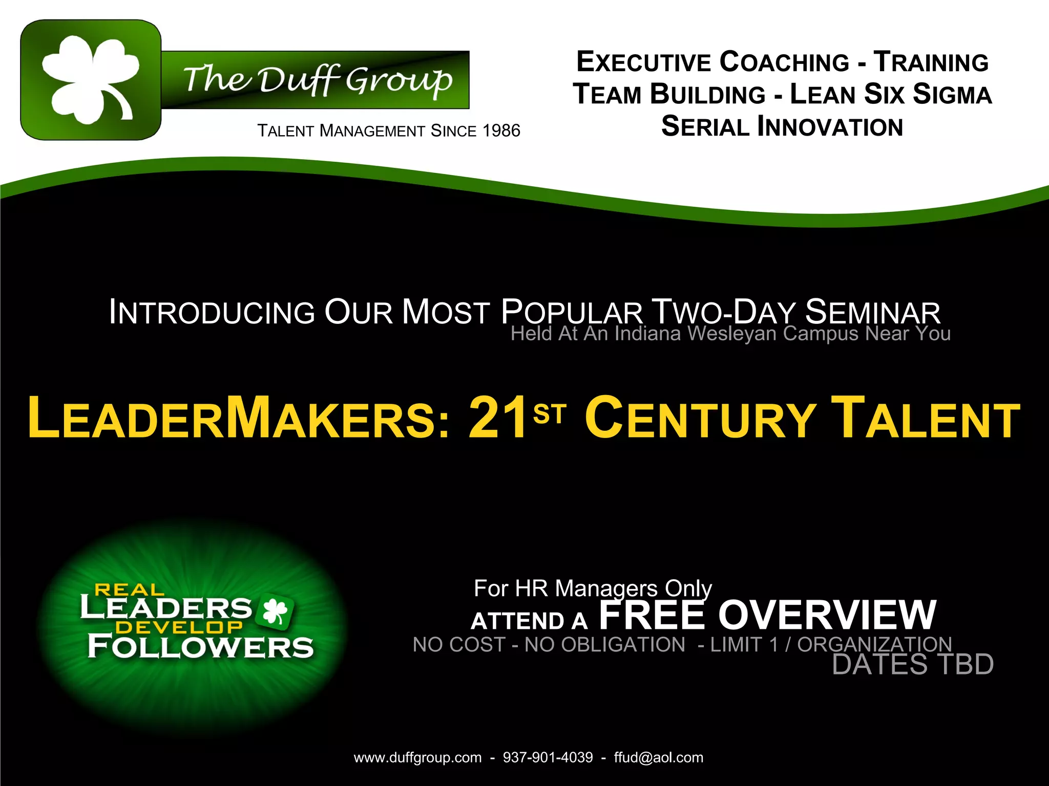 This document advertises and summarizes a two-day seminar on 21st century talent management for HR managers. It will be held at various Indiana Wesleyan University regional campuses. Attendees will learn about attracting, developing, promoting and retaining top talent. The seminar will discuss topics like the importance of emotional intelligence, mentors, leadership styles, and why employees stay or quit. HR managers from Fortune 500 companies, non-profits and government agencies are encouraged to attend a free overview with no cost and no obligation.