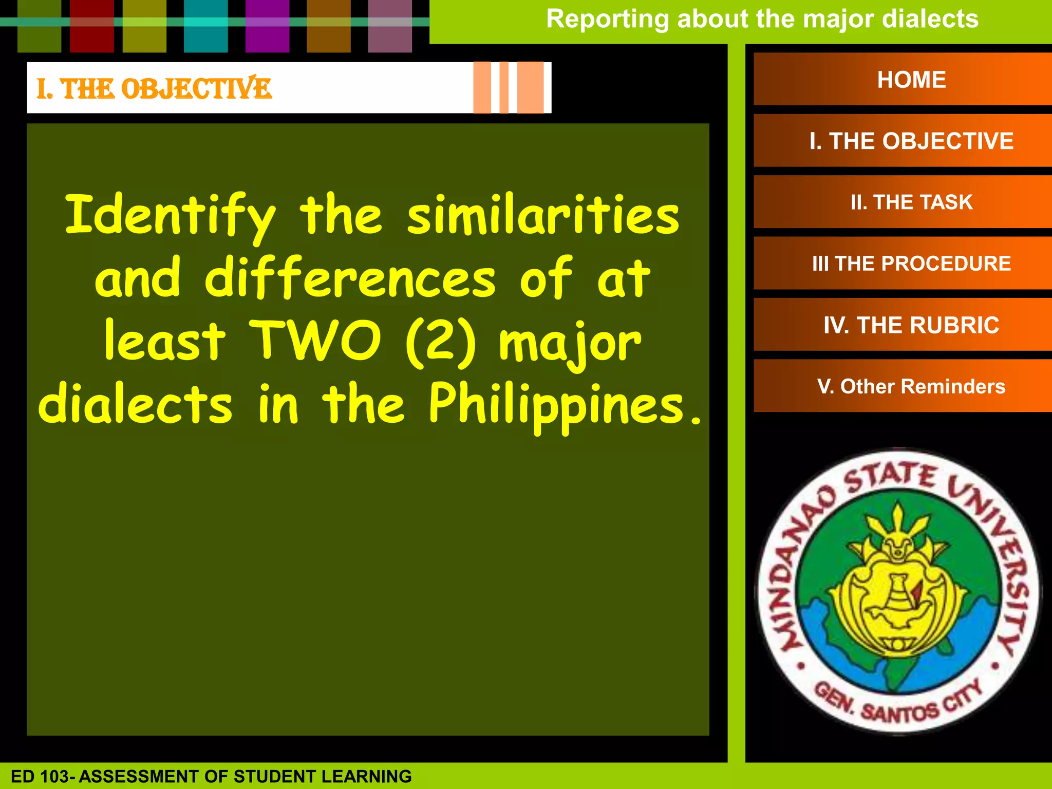 This document outlines the procedures and requirements for a group reporting assignment on the major dialects in the Philippines for an Education 103 class at Mindanao State University. The objective is to identify the similarities and differences of at least two major dialects. Students will be divided into groups who will research and present on assigned dialect pairs. The presentations will be assessed based on a rubric evaluating content, organization, creativity, delivery, and overall presentation.