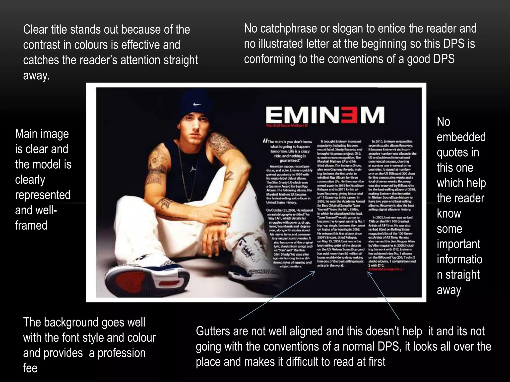 This document provides an analysis of a digital publication spread (DPS). It notes that the DPS has an effective title that stands out due to contrasting colors. However, it is missing some key elements like an embedded quote, page numbers, and well-aligned gutters. Overall, the analysis comments that the DPS generally follows conventions but could be improved.