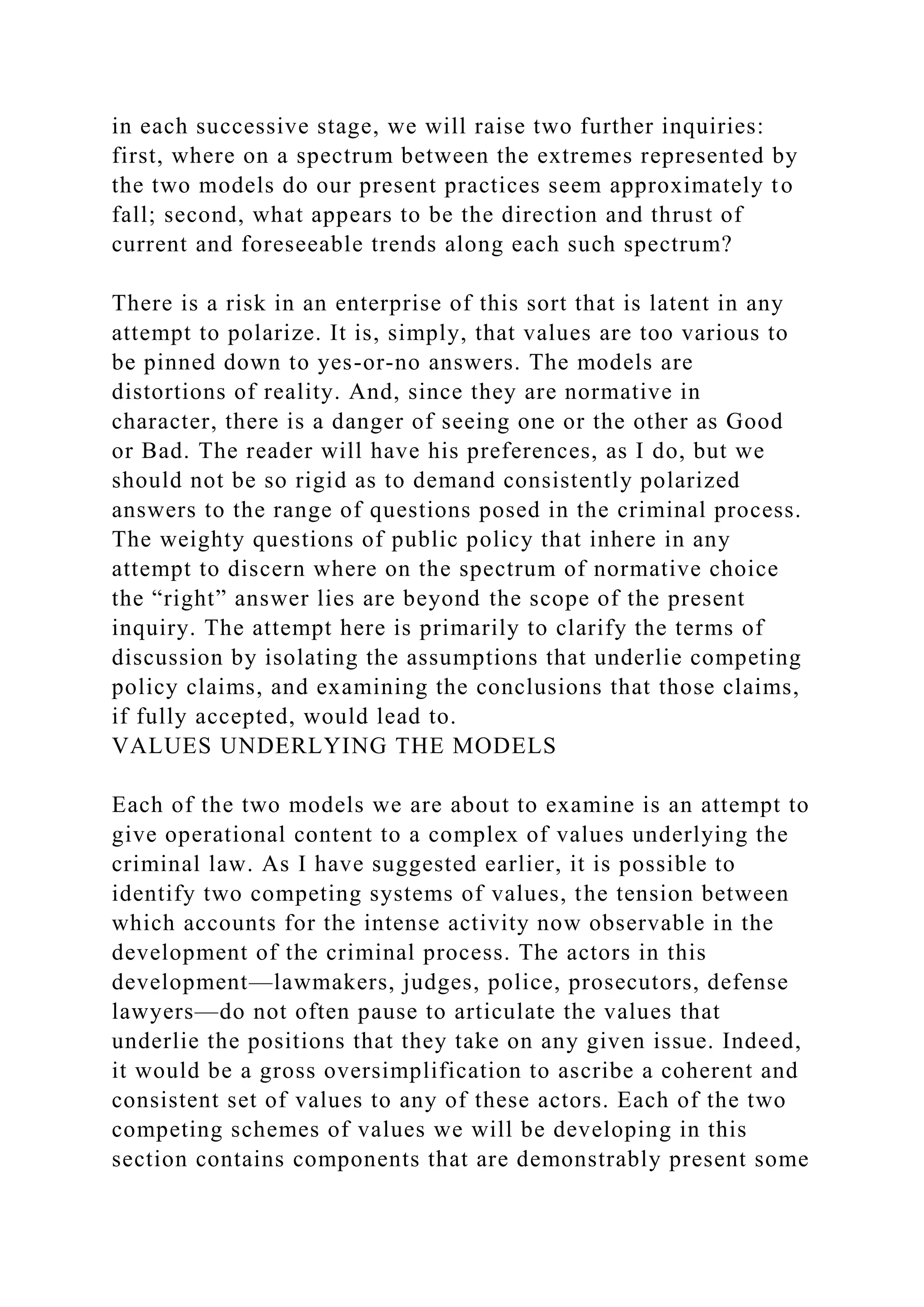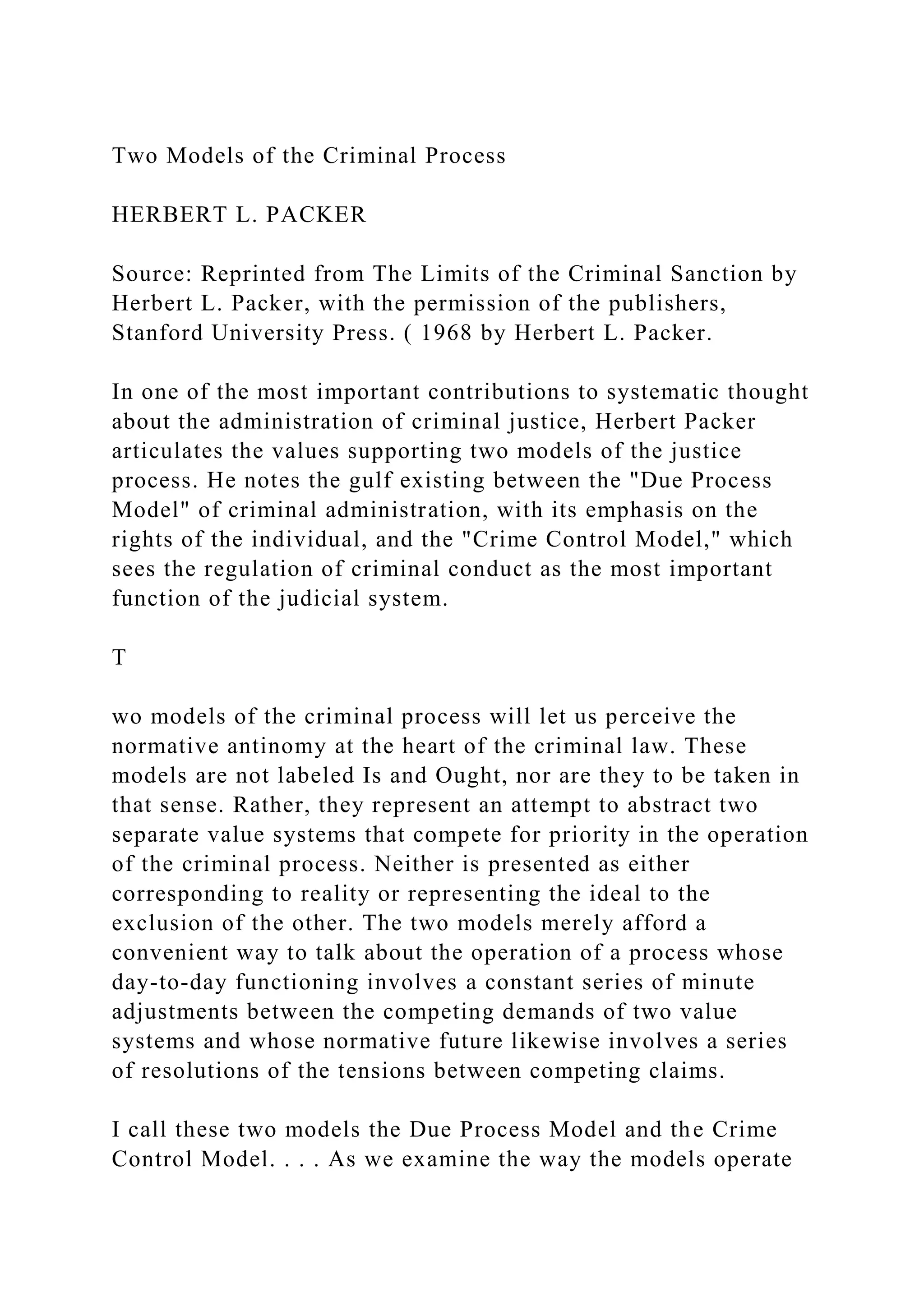 Herbert L. Packer discusses two contrasting models of the criminal process: the due process model, which emphasizes individual rights, and the crime control model, which prioritizes the regulation of criminal conduct. He examines these models to reveal underlying normative tensions in the criminal justice system, highlighting their operational implications within the context of American society. While neither model fully captures reality, they serve as frameworks for analyzing competing values and assumptions that shape criminal law and policy.