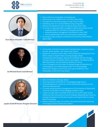 The document describes Bloomer Fellows, a 22-week mentorship program for underserved high school students. It aims to provide students with personal and professional clarity to effectively start their careers. The fully student-led program focuses on routines, habits, self-love and understanding. It connects students to real tech and business professionals, as well as scholarship and mentorship organizations. The curriculum includes foundations like goal-setting, projects and portfolios, and networking and career building.