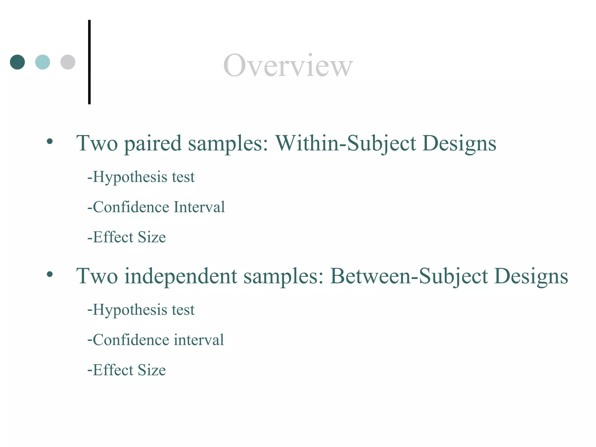 This document summarizes statistical tests for comparing two samples, including paired and independent samples t-tests, confidence intervals, and effect sizes. For paired samples from within-subject designs, a paired t-test is used to test for differences between means. For independent samples from between-subject designs, an independent samples t-test is used. Both tests calculate a t-statistic based on the mean difference and standard error. Confidence intervals and effect sizes can also be calculated for paired and independent sample designs. Examples are provided to demonstrate how to perform the statistical tests and calculations.