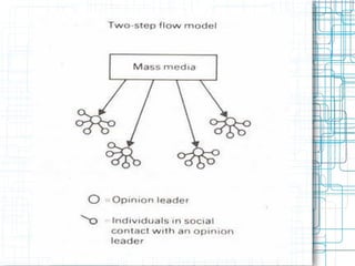 The document discusses the two-step flow of communication theory, developed by Elihu Katz and Paul Lazarsfeld, which posits that mass media messages first reach opinion leaders and are then interpreted and shared with the broader population. It reviews various studies on the influence of interpersonal relationships in decision-making compared to mass media, concluding that personal influence often plays a more significant role. Additionally, it explores the relevance of this theory in contemporary communication dynamics, particularly on social media platforms.