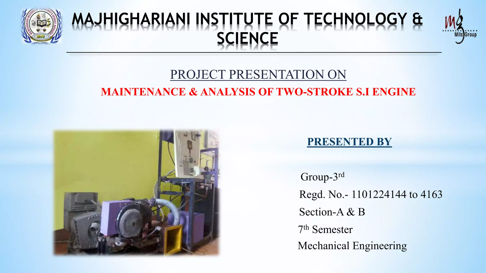 The document is a project presentation on the maintenance and analysis of a two-stroke SI engine, detailing its components, maintenance procedures, and experimental methodologies. It outlines the engine's functioning, tests conducted on the engine, and includes advantages and disadvantages of using a two-stroke engine. Additionally, the document contains specifications for the test rig, observation tables, and precautions for safe operation.