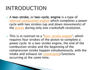 The document discusses two-stroke diesel engines. A two-stroke diesel engine completes a power cycle in two strokes of the piston during one crankshaft revolution, in contrast to a four-stroke engine which takes four strokes. In a two-stroke diesel engine, intake and exhaust occur simultaneously. The engine has five basic events - intake, compression, ignition, power, and exhaust - all completed in two strokes, making it more compact than a four-stroke engine. Two-stroke diesel engines are commonly used in large ships and generators due to their efficiency.