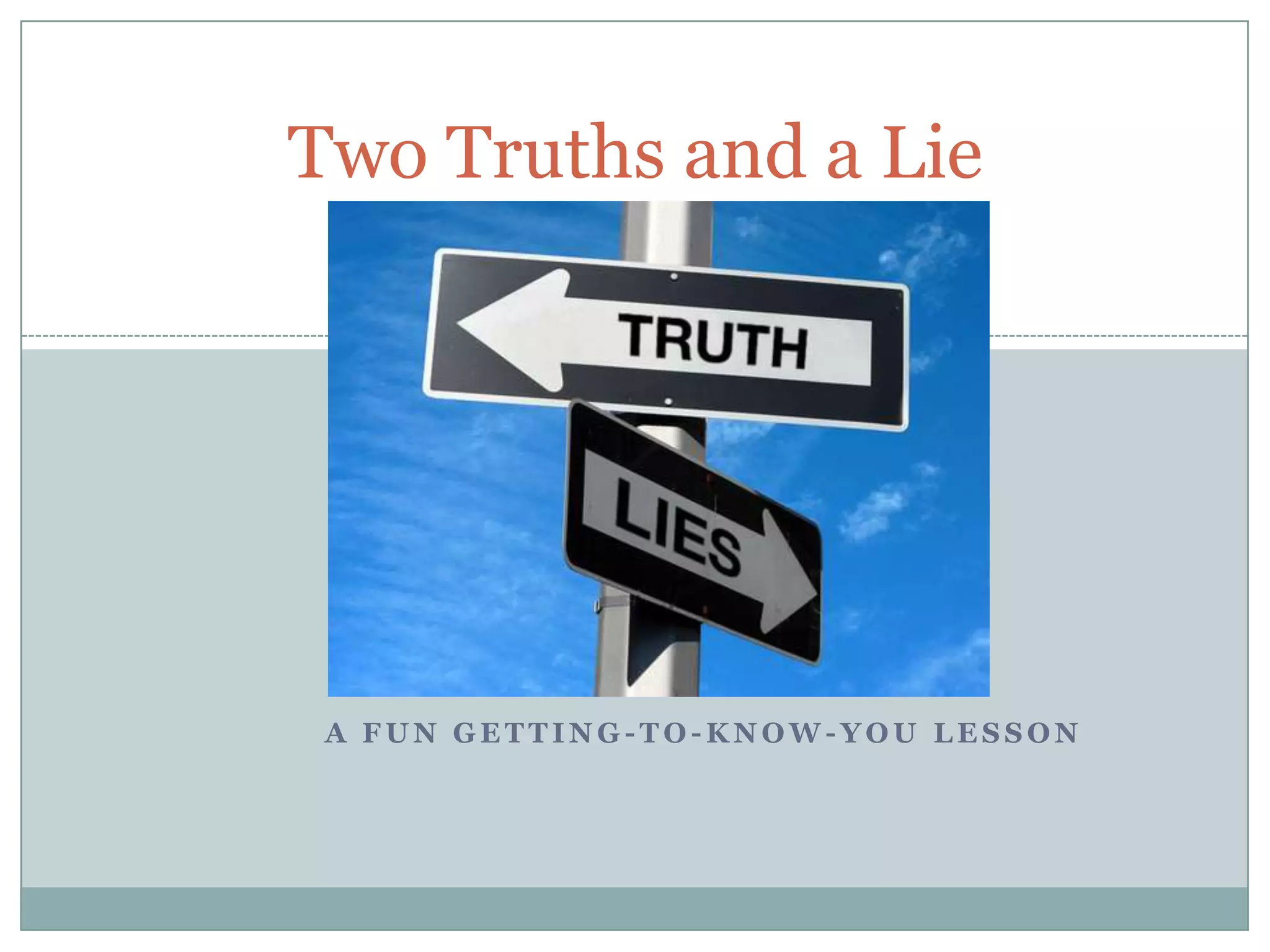 This document introduces the icebreaker game "Two Truths and a Lie", where each person shares three personal statements about themselves but one is a lie. The rules are explained - players take turns sharing their three statements and the others try to guess which is untrue. Tips are provided for crafting believable statements and asking follow up questions to determine the lie. The reader is then invited to write their own two truths and a lie to play the game.