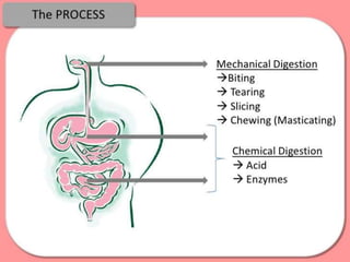This document discusses the two types of digestion: mechanical and chemical. Mechanical digestion is the physical breakdown of food using mechanical forces, like chewing. Chemical digestion is the breakdown of food into nutrients at a molecular level using digestive enzymes. The document then describes where each type of digestion occurs within the digestive system, including mechanical digestion in the mouth by chewing and chemical digestion by saliva breaking down carbs. It further explains mechanical and chemical digestion in other parts like the stomach and small intestine.