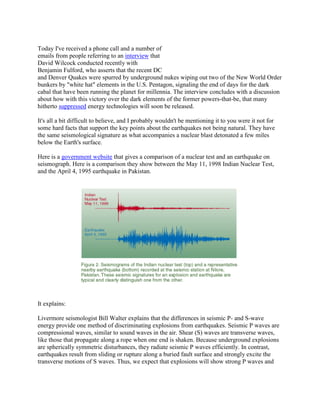 The document discusses evidence that the recent earthquakes in Denver and Washington D.C. on August 23rd were caused by underground nuclear explosions rather than being natural occurrences. Specifically, it points to seismograph readings of the quakes which show strong P waves and weak S waves, a signature that matches underground nuclear detonations more than natural earthquakes. It also notes the unusual timing and locations of the quakes. The document then summarizes an interview where it was proposed that the nukes were detonated by "white hat" military forces to destroy underground bunker cities that were controlled by the New World Order. While speculative, the document argues the seismology evidence supports the quakes not being natural and warrants further investigation