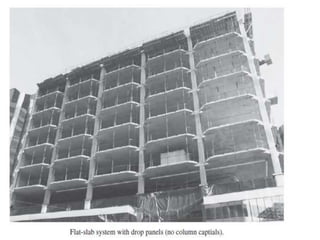 This document discusses two-way slabs, which are supported on all four sides or at column centerlines. It describes two main types - edge supported slabs and column supported slabs. Edge supported slabs are suitable for spans of 20-30 feet and live loads of 60-120 psf. They have increased stiffness and low deflection. Column supported slabs include flat slabs and two-way ribbed/waffle slabs. Flat slabs have no beams or column capitals and are suitable for spans of 20-30 feet. Ribbed and waffle slabs have reduced dead load and architectural beauty, with spans of 30-48 feet and live loads of 60-120 psf. The document also discusses minimum