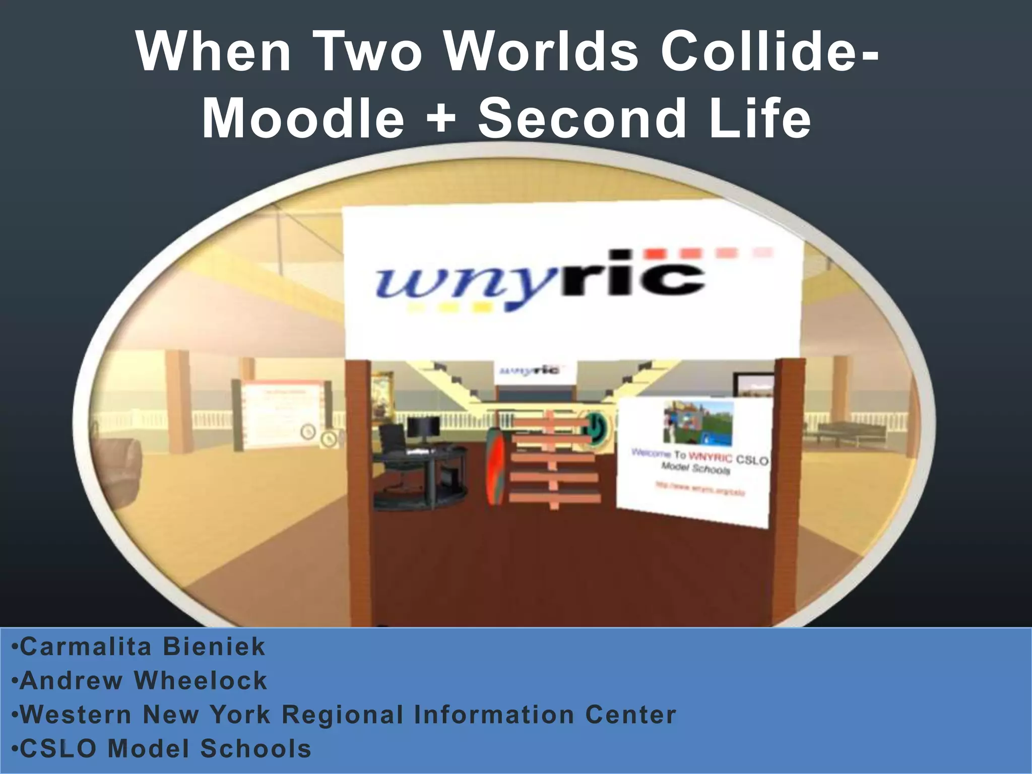 This document discusses integrating the virtual world Second Life with the learning management system Moodle, called "Sloodle". It proposes using Sloodle for virtual field trips and cross-cultural collaboration. Two professional development courses are described: one focused on social studies using virtual museums, the other multi-disciplinary covering various subject areas. Participants would learn about virtual worlds, Moodle tools, and create lesson plans or presentations to share. Contact information is provided for the project leaders to find out more.