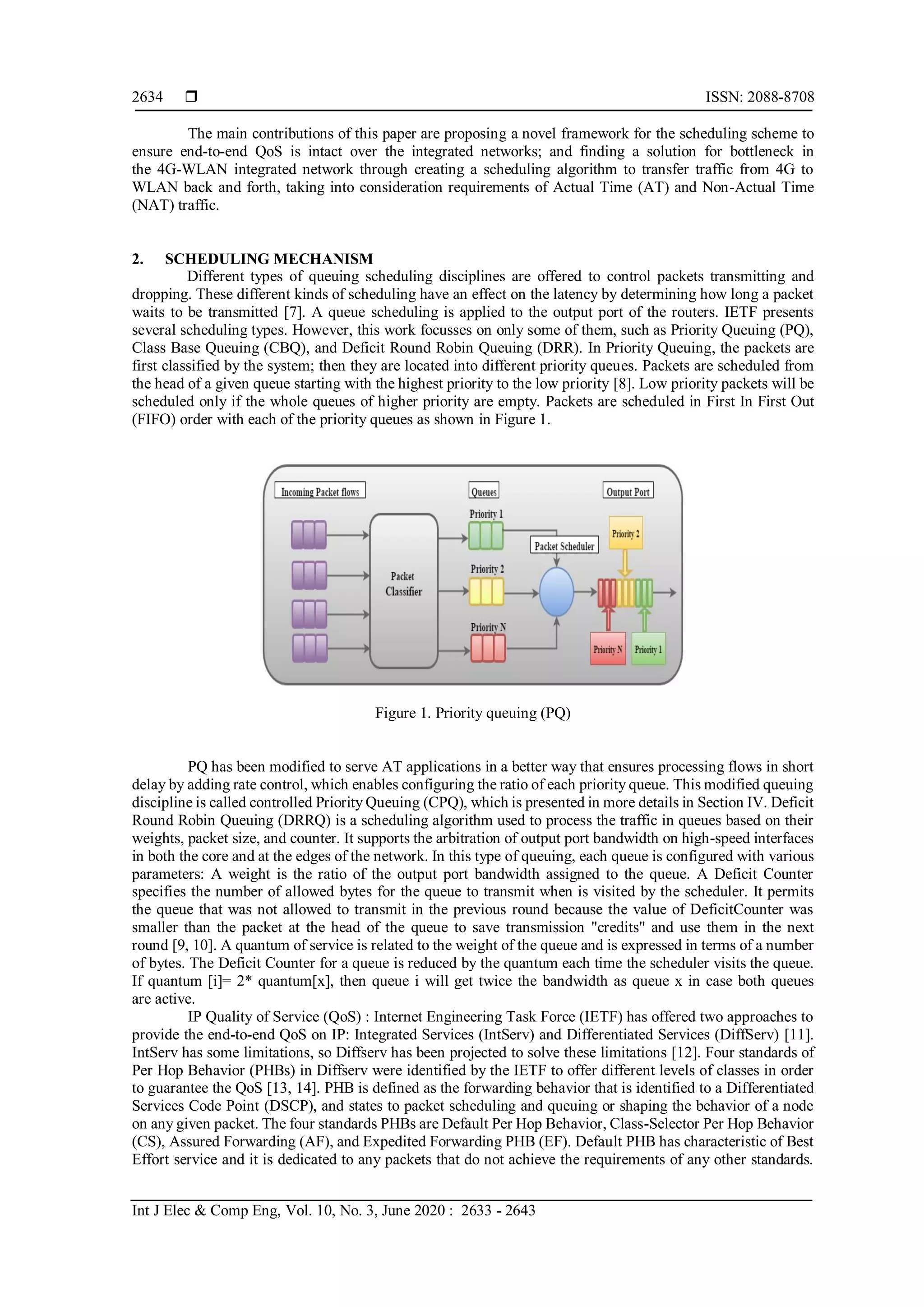 The paper presents a novel two-level scheduling scheme for optimizing the integration of 4G and WLAN networks to enhance end-to-end Quality of Service (QoS). It differentiates between actual time traffic (ATT) and non-actual time traffic (NATT) using Class-Based Queuing (CBQ) and Deficit Round Robin (DRR) for scheduling, achieving significant improvements in traffic management and performance metrics such as delay and throughput. Through simulations, the proposed method demonstrates its effectiveness in maintaining the performance requirements of both ATT and NATT applications.