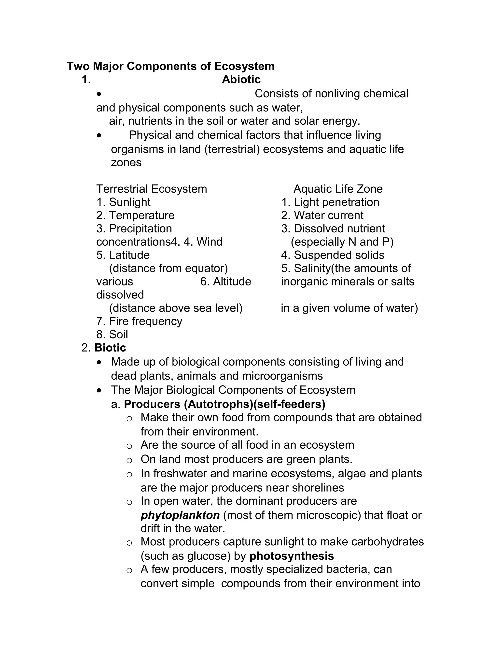 2. Biotic components are the living parts, including producers, consumers, and decomposers. Producers like plants capture energy through photosynthesis. Consumers eat producers or other organisms. Decomposers break down dead organic material and release nutrients.