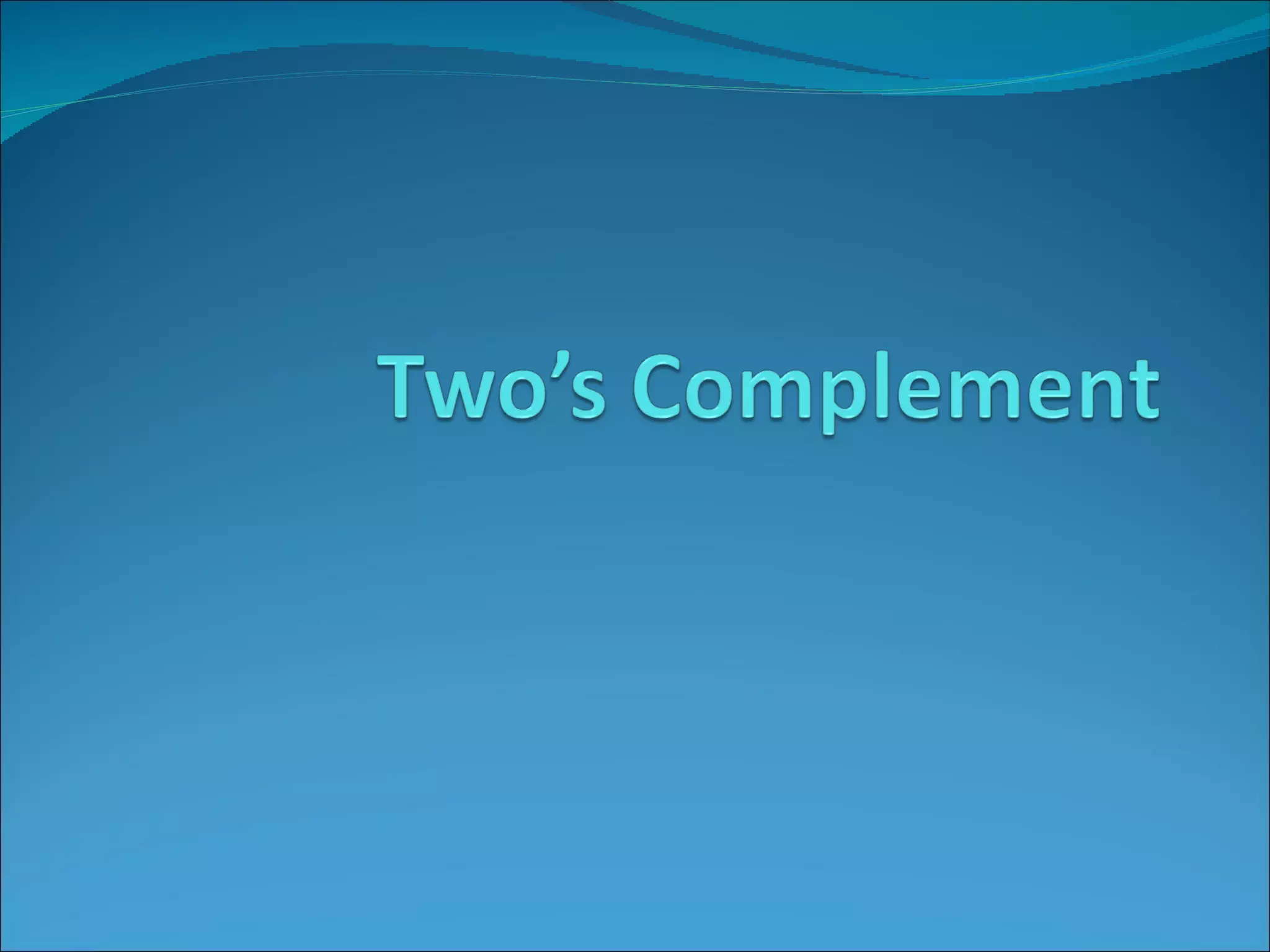 Two's complement representation allows binary arithmetic on signed integers to yield the correct results. Positive numbers are represented as simple binary, while negative numbers are the binary complement of the corresponding positive number. The most significant bit indicates the sign, with 0 being positive and 1 being negative. To calculate the two's complement of a number, invert and add 1 to its binary representation. Two's complement arithmetic follows the same rules as binary arithmetic. Overflow occurs when adding two numbers of the same sign yields a result with the opposite sign.