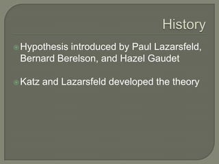 The two-step flow theory of communication proposes that (1) opinion leaders first receive information from the mass media and (2) then pass on their interpretations of that information to less active individuals. The theory was developed by Paul Lazarsfeld, Bernard Berelson, and Hazel Gaudet and further expanded on by Katz and Lazarsfeld. It uses a model where opinion leaders pay close attention to media messages and influence others similar to them, while the "influentials" look to the opinion leaders rather than directly receiving information from the media.
