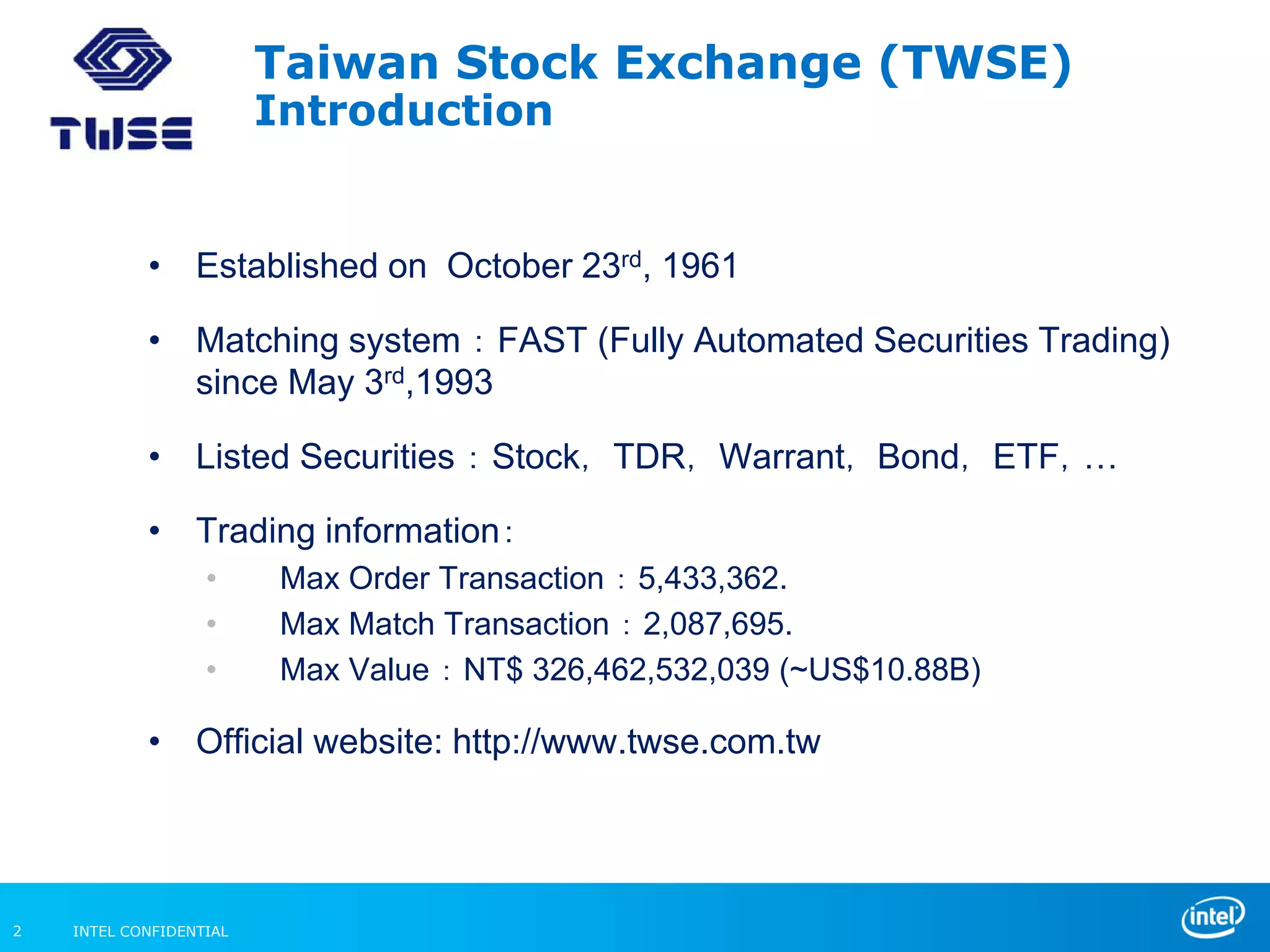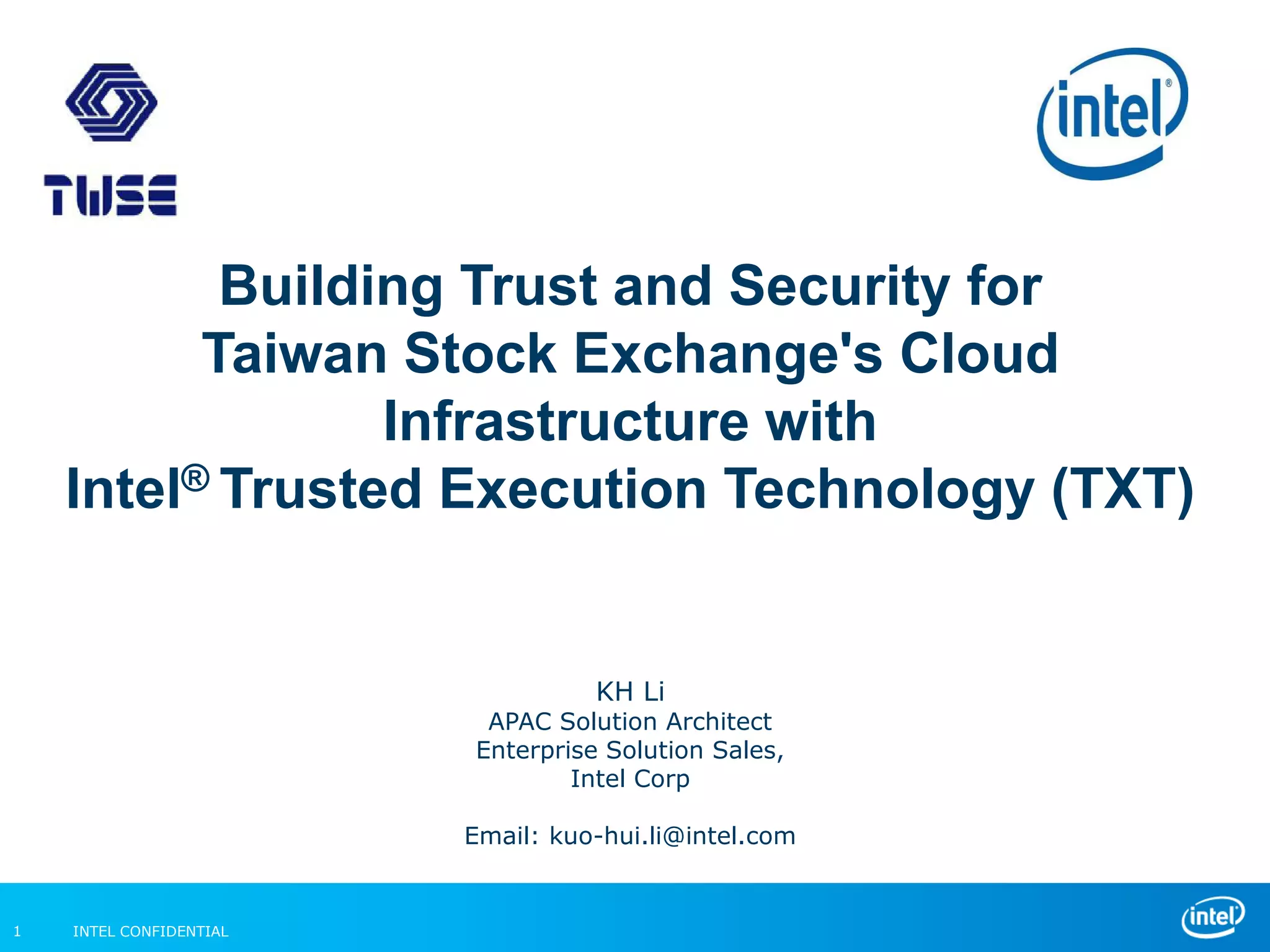 The Taiwan Stock Exchange was looking to improve the security and trust of their cloud infrastructure. They worked with Intel to test Intel Trusted Execution Technology (TXT), which provides hardware-based security features. A proof of concept system was set up using TXT that demonstrated its ability to 1) verify the integrity of platform software and hardware at launch, 2) control VM placement based on platform trust levels, and 3) facilitate automated compliance reporting. The POC was successful in addressing the TWSE's requirements for enhanced visibility, control, and auditability in their cloud environment.