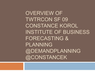 This document provides an overview and key learnings from the TWTRCON SF 09 conference. Some of the main points covered include using Twitter for specific goals like telemarketing, engaging users by responding to all, and organizing content using tools like Bitly, Hootsuite, and CoTweet. The conference focused on the user experience by allowing attendees to vote on topics and presenters. References and links are provided for conference materials, presentations, blogs, and Flickr photos from the event.