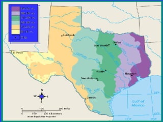 Texas has a variety of climates that influence its landscape and human activity. The state's climate is affected by its location, winds, proximity to the Gulf of Mexico, elevation, and rainfall levels, which increase from west to east and can cause drought. Texas experiences severe weather events like tornadoes, hurricanes, and blizzards. The state's vegetation provides habitat for wildlife but some animals' habitats have been destroyed, leading to extinction. Lady Bird Johnson helped beautify Texas highways with native wildflowers and established a wildlife research center to study plants and prevent erosion.