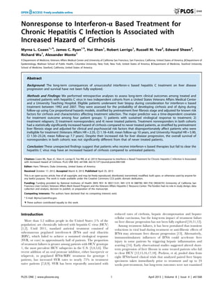 This study analyzed clinical outcomes of treated and untreated patients with hepatitis C virus (HCV) infection in two cohorts. It found that HCV patients who did not respond to interferon-alpha based treatment had a significantly increased risk of developing cirrhosis compared to untreated patients, even after adjusting for factors like fibrosis stage and psychosocial risks. Specifically, treatment nonresponders had a 2.35 times higher hazard of cirrhosis in the Veterans Affairs cohort and a 5.9 times higher hazard in the University Hospital cohort compared to untreated patients. However, the overall survival of nonresponders was not significantly different than untreated patients. This suggests that while interferon-alpha treatment failure may accelerate liver fibrosis, it does not necessarily impact overall