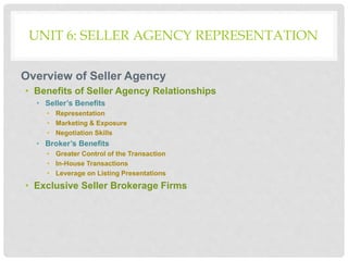 This document discusses seller agency representation and listing agreements. It covers the benefits of seller agency for both the seller and broker. It also outlines typical clauses included in listing agreements, such as listing price, term, compensation, and seller representations. Finally, it addresses disclosure issues like completing seller disclosure notices and potential hazards to disclose regarding property condition.