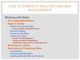 This document discusses real estate agency practices and risk management. It covers topics like working with sellers and buyers, including listing appointments, setting prices, making offers. It also discusses different agency situations like working for a seller or buyer. The document also discusses important risk management practices like following ethics codes, getting errors and omissions insurance, avoiding lawsuits, and complying with laws around discrimination, advertising, and handling trust accounts properly.