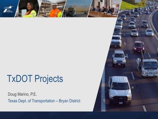 Doug Marino from TxDOT's Bryan District presented several transportation projects currently under construction or development in College Station to the City Council. Four projects are currently under construction - a shared use path on South College Ave, raised medians on George Bush Dr, intersection improvements at Wellborn Rd/Holleman Dr, and a super street on FM 2818 from University Dr to Wellborn Rd. Several other major projects are under development, including expanding SH 6 from SH 21 to SH 40, building an underpass at George Bush Dr/Wellborn Rd, widening Wellborn Rd, adding a shared use path along SH 30 from Texas Ave to SH 6, and developing a pedestrian concept for FM 60 in the Northgate area.