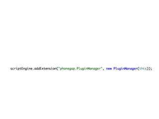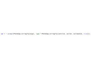 This document provides an overview of building mobile applications using PhoneGap. It discusses how PhoneGap works by instantiating a chromeless browser and implementing a bridge to allow calling native device APIs from JavaScript. It also covers topics like plugins, debugging mobile apps, performance considerations, and the PhoneGap API for accessing device features like the camera, contacts, and geolocation. The document advocates for a mobile-first approach using modern web standards and technologies when building apps with PhoneGap.
