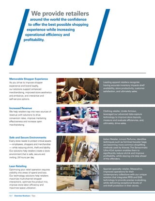 This document summarizes Tyco's retail performance and security solutions. It discusses how their solutions help retailers improve the shopper experience, increase revenue, ensure safe and secure environments, optimize operations, and provide accurate inventory management. Specific solutions mentioned include store execution, safety and security, loss prevention, traffic intelligence, and inventory intelligence. Case studies are provided of retailers who successfully used Tyco's solutions to reduce shrink, improve operations, increase sales and customer satisfaction. Tyco positions itself as a global leader in retail solutions with deep industry experience and a full portfolio of technologies and services.