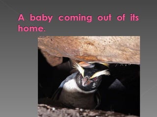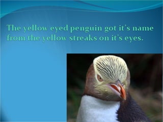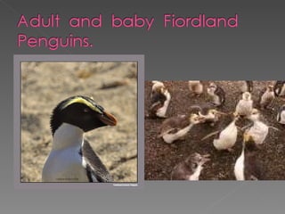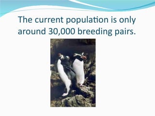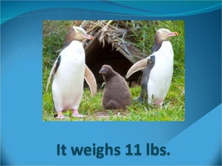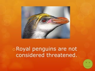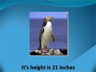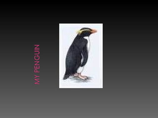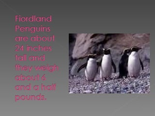 The document provides information about different penguin species in 3 or less sentences per species. It discusses the black footed penguin, erect-crested penguin, Galapagos penguin, Gentoo penguin, king penguin, little blue penguin, macaroni penguin, Magellanic penguin, emperor penguin, chinstrap penguin, Peruvian penguin, rockhopper penguin, royal penguin, Snares crested penguin, Fiordland crested penguin, Adelie penguin and yellow eyed penguin. Key details provided for each species include their physical characteristics, habitat and diet.